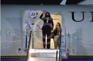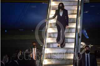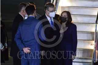 CIUDAD DE MÉXICO, 07JUNIO2021.- Kamala Harris, vicepresidenta de Estados Unidos, durante su arribo al hangar de la Base Aérea Militar número 19 del Aeropuerto Internacional de la Ciudad de México (AICM) con motivo de su visita al país. Harris, fue recibida por Marcelo Ebrard, secretario de Relaciones Exteriores. FOTO: MARIO JASSO/CUARTOSCURO.COM