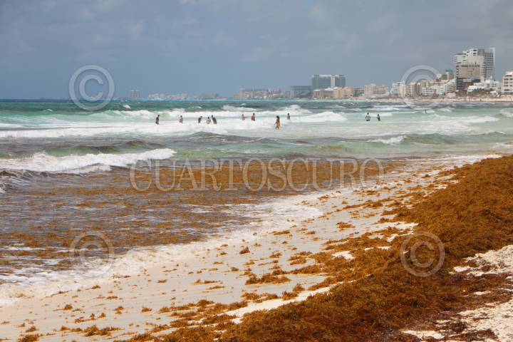 CANCÚN, QUINTANA ROO, 08JUNIO2021.- Gran cantidad de sargazo se observa en la la Playa Gaviota Azul, turistas conviven con esta macroalga durante su estancia a las orillas del mar. FOTO: ELIZABETH RUIZ/CUARTOSCURO.COM