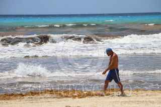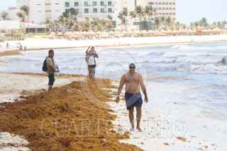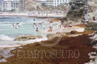 CANCÚN, QUINTANA ROO, 08JUNIO2021.- Gran cantidad de sargazo se observa en la la Playa Gaviota Azul, turistas conviven con esta macroalga durante su estancia a las orillas del mar. FOTO: ELIZABETH RUIZ/CUARTOSCURO.COM