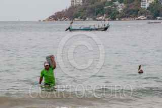ACAPULCO, GUERRERO, 08JUNIO2021.- Pescadores y bañistas, durante un dia de playa nublado en Las Hamacas, situada en la zona tradicional del puerto de Acapulco. FOTO: CARLOS ALBERTO CARBAJAL/CUARTOSCURO.COM