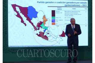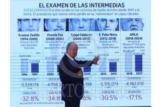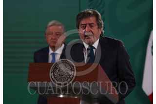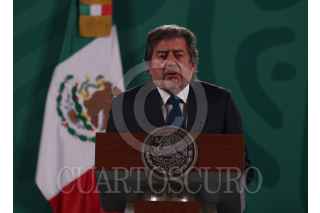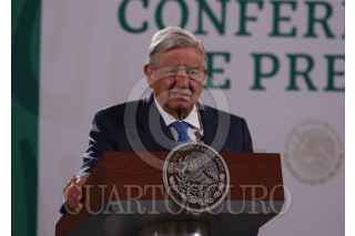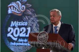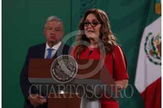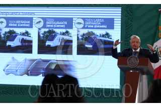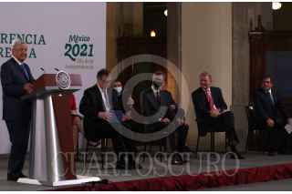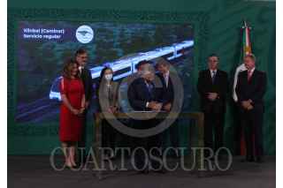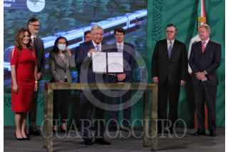 CIUDAD DE MÉXICO, 08JUNIO2021.- Andrés Manuel López Obrador, presidente de México acompañado de Marcelo Ebrard Casaubon, secretario de Relaciones Exteriores; Jean-Pierre Asvazadourian, embajador de Francia; Greeme C. Clark, embajador de Canadá; Rogelio Jiménez Pons, director general del Fondo Nacional de Fomento al Turismo (Fonatur); María Teresita Ramos Gómez, directora general en Méxicodel Alstom Transport; Sandra Palacios Ríos, directora comercial de Bombardier y Transportation; Thierry Best, director comercial de Alstom Transport, durante conferencia de prensa matutina en Palacio Nacional donde se realizó firma de convenio para la compra de convoyes para la construcción del Tren Maya. FOTO: ANDREA MURCIA /CUARTOSCURO.COM