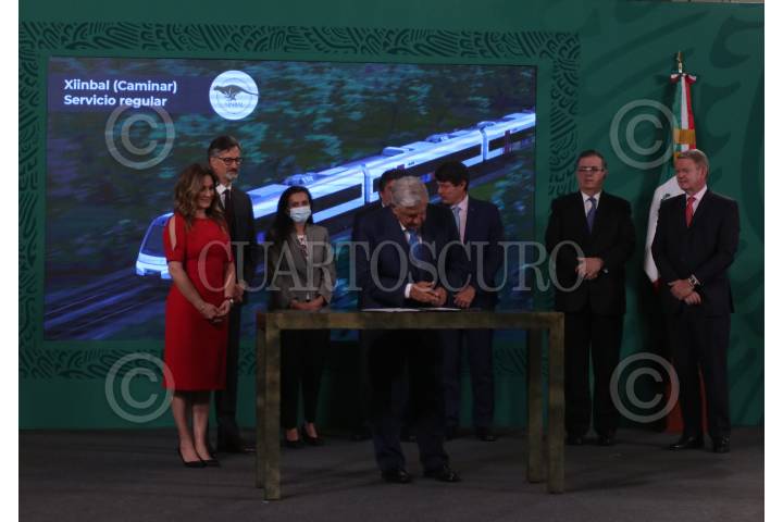 CIUDAD DE MÉXICO, 08JUNIO2021.- Andrés Manuel López Obrador, presidente de México acompañado de Marcelo Ebrard Casaubon, secretario de Relaciones Exteriores; Jean-Pierre Asvazadourian, embajador de Francia; Greeme C. Clark, embajador de Canadá; Rogelio Jiménez Pons, director general del Fondo Nacional de Fomento al Turismo (Fonatur); María Teresita Ramos Gómez, directora general en Méxicodel Alstom Transport; Sandra Palacios Ríos, directora comercial de Bombardier y Transportation; Thierry Best, director comercial de Alstom Transport, durante conferencia de prensa matutina en Palacio Nacional donde se realizó firma de convenio para la compra de convoyes para la construcción del Tren Maya. FOTO: ANDREA MURCIA /CUARTOSCURO.COM
