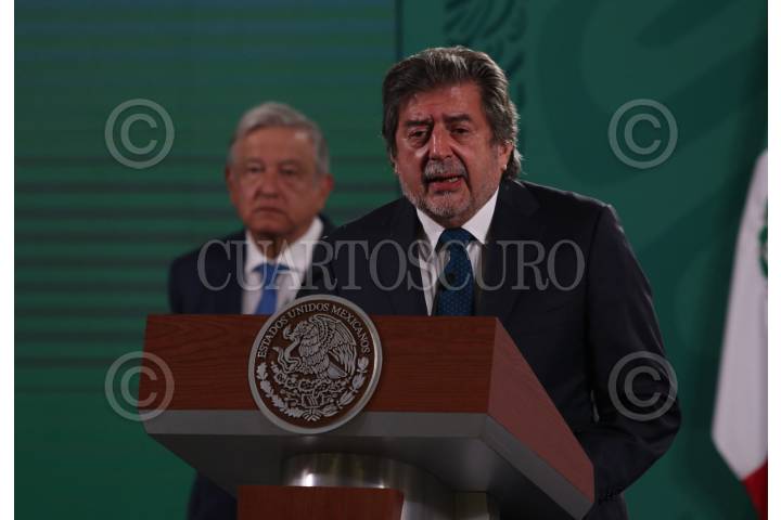 CIUDAD DE MÉXICO, 08JUNIO2021.- Andrés Manuel López Obrador, presidente de México acompañado de Marcelo Ebrard Casaubon, secretario de Relaciones Exteriores; Jean-Pierre Asvazadourian, embajador de Francia; Greeme C. Clark, embajador de Canadá; Rogelio Jiménez Pons, director general del Fondo Nacional de Fomento al Turismo (Fonatur); María Teresita Ramos Gómez, directora general en Méxicodel Alstom Transport; Sandra Palacios Ríos, directora comercial de Bombardier y Transportation; Thierry Best, director comercial de Alstom Transport, durante conferencia de prensa matutina en Palacio Nacional donde se realizó firma de convenio para la compra de convoyes para la construcción del Tren Maya. FOTO: ANDREA MURCIA /CUARTOSCURO.COM