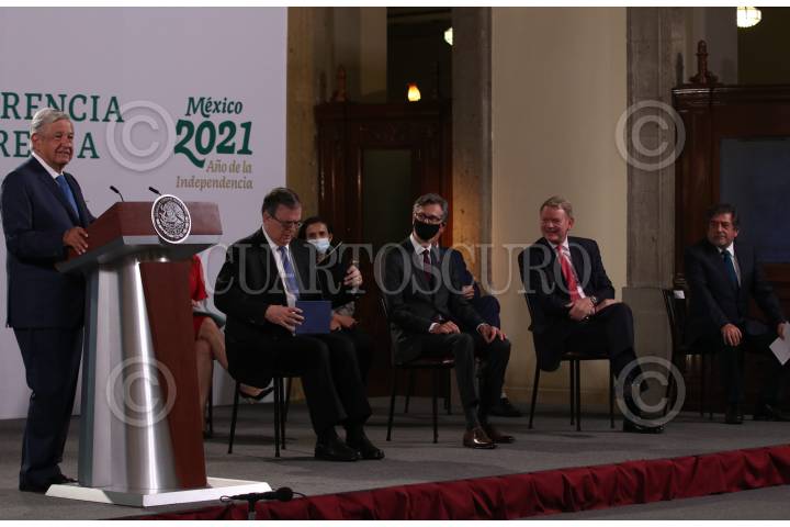 CIUDAD DE MÉXICO, 08JUNIO2021.- Andrés Manuel López Obrador, presidente de México acompañado de Marcelo Ebrard Casaubon, secretario de Relaciones Exteriores; Jean-Pierre Asvazadourian, embajador de Francia; Greeme C. Clark, embajador de Canadá; Rogelio Jiménez Pons, director general del Fondo Nacional de Fomento al Turismo (Fonatur); María Teresita Ramos Gómez, directora general en Méxicodel Alstom Transport; Sandra Palacios Ríos, directora comercial de Bombardier y Transportation; Thierry Best, director comercial de Alstom Transport, durante conferencia de prensa matutina en Palacio Nacional donde se realizó firma de convenio para la compra de convoyes para la construcción del Tren Maya. FOTO: ANDREA MURCIA /CUARTOSCURO.COM