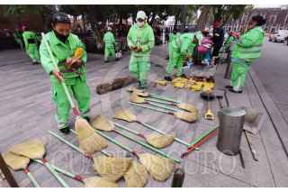 CIUDAD DE MÉXICO, 0NIO2021.- Trabajadores de limpieza reciben escobas, recogedores, impermeables y fajas previo a iniciar su jornada laboral en la Alameda Central. FOTO: MOISÉS PABLO/CUARTOSCURO.COM