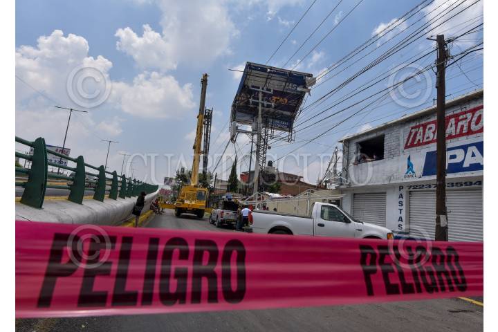 TOLUCA, ESTADO DE MÉXICO, 09JUNIO2021.- Debido a la fuerte lluvia que se registró la noche de este martes un espectacular colapso en Paseo Tollocan, en la delegación Seminario Segunda Sección, la zona fue acordonada por personal de Protección Civil para evitar cualquier riesgo mientras se realizan los trabajos de retiro. FOTO: CRISANTA ESPINOSA AGUILAR /CUARTOSCURO.COM