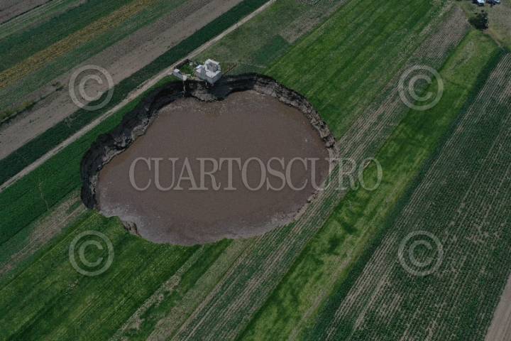 SANTA MARÍA ZACATEPEC, PUEBLA, 09JUNIO2021.- A 11 días del surgimiento del socavón en la entidad poblana, elementos de protección civil, Sedena y policía estatal resguardan la zona del derrumbe a fin de evitar accidentes. Hasta el momento, el hundimiento registras 126 metros de diámetro en su parte superior y 114 en la parte inferior, así como 20 metros de profundidad. Los dos perros que cayeron en el interior permanecen ahí en espera de que se efectúen operativo de rescate. FOTO: GALO CAÑAS/CUARTOSCURO.COM