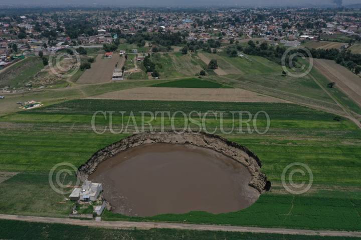 SANTA MARÍA ZACATEPEC, PUEBLA, 09JUNIO2021.- A 11 días del surgimiento del socavón en la entidad poblana, elementos de protección civil, Sedena y policía estatal resguardan la zona del derrumbe a fin de evitar accidentes. Hasta el momento, el hundimiento registras 126 metros de diámetro en su parte superior y 114 en la parte inferior, así como 20 metros de profundidad. Los dos perros que cayeron en el interior permanecen ahí en espera de que se efectúen operativo de rescate. FOTO: GALO CAÑAS/CUARTOSCURO.COM