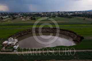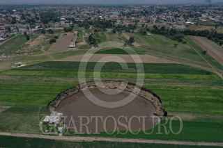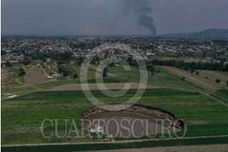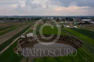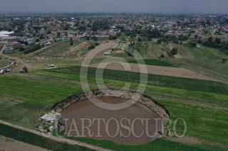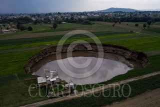 SANTA MARÍA ZACATEPEC, PUEBLA, 09JUNIO2021.- A 11 días del surgimiento del socavón en la entidad poblana, elementos de protección civil, Sedena y policía estatal resguardan la zona del derrumbe a fin de evitar accidentes. Hasta el momento, el hundimiento registras 126 metros de diámetro en su parte superior y 114 en la parte inferior, así como 20 metros de profundidad. Los dos perros que cayeron en el interior permanecen ahí en espera de que se efectúen operativo de rescate. FOTO: GALO CAÑAS/CUARTOSCURO.COM