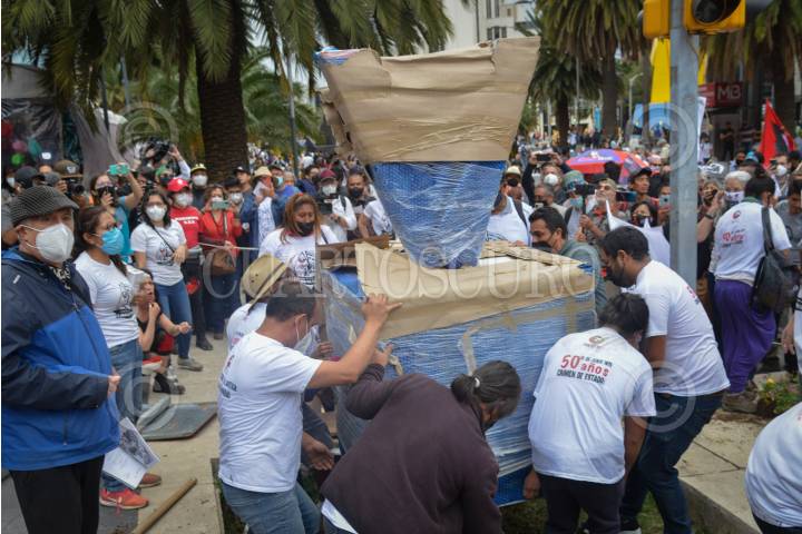 El Comité 68 Pro Libertades Democráticas e integrantes de organizaciones sociales colocaron un antimonumento sobre avenida Juárez en conmemoración del 50 aniversario de la "Matanza de Corpus Christi" conocida como "El Halconazo".