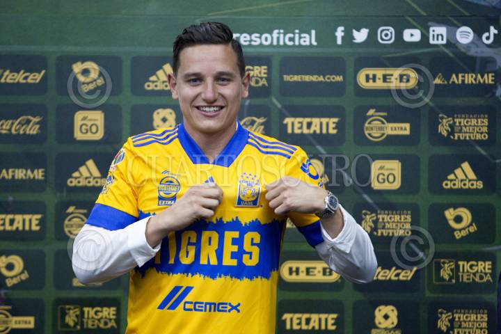 SAN NICOLÁS DE LOS GARZA, NUEVO LEÓN, 11JUNIO2021.- El futbolista francés Florian Thauvin fue presentado en el estadio universitario para formar parte del equipo de los Tigres de la UANL, quien tendrá el número 26 en la camiseta. El ex jugador del Marsella, arribó ayer a la ciudad de Monterrey. FOTO: GABRIELA PÉREZ MONTIEL / CUARTOSCURO.COM
