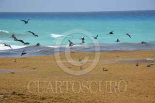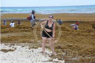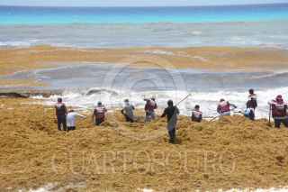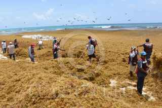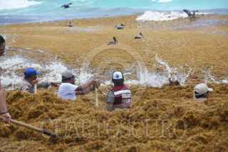 CANCÚN, QUINTANA ROO, 12JUNIO2021.- A un mes de iniciar el periodo vacacional de verano, el destino se ha visto afectado por grandes cantidades de sargazo en algunas de las principales playas. En Playa Marlín, desde este fin de semana se notó un gran recale del alga, por lo que trabajadores de la Zona Federal Marítimo Terrestre (Zofemat) comenzaron desde temprano con la recoja de la misma. De acuerdo con la Red de Monitoreo del Sargazo Cancún los vientos del sureste, con rachas de hasta 35 km/hr, así como la presencia abundante de balsas de macroalgas en los primeros 10 km de la costa, propiciarán que siga recalando sargazo en la mayoría de los puntos monitoreados de la costa norte de Quintana Roo. FOTO: ELIZABETH RUIZ/CUARTOSCURO.COM