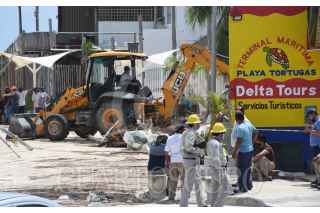CANCÚN, QUINTANA ROO, 12JUNIO2021.- Autoridades de los tres niveles de gobierno encabezados por la Fiscalía General del Estado, llevaron a cabo el operativo "Playas Libres", ahora en playa Tortugas en la zona hotelera, donde decomisaron mobiliario y aseguraron establecimientos. Desde las 6:00 de la mañana las autoridades de la Fiscalía, Policía Ministerial, Quintana Roo, Guardia Nacional, SEDENA y Marina arribaron al kilómetro 7 del bulevar Kukulcán, con apoyo de al menos seis camiones tipo volquete. La finalidad de esta operación, fue asegurar camastros, sombrillas, destruir palapas y retirar todo lo que obstaculizara el libre tránsito de los bañistas que visitan dicho arenal. Fueron clausurados tres locales irregulares, habilitados como venta de tours turísticos y minisuper, los cuales quedaron bajo resguardo de la Fiscalía estatal. Cabe mencionar, que esté operativo se da, tras la doble ejecución de unos vendedores de artesanías que tenían su local en playa Tortugas y que ayer fueron acribillados a balazos. Asi mismo, en ese ataque una joven turista estadounidense resultó con dos impactos de bala, en tórax y pierna, siendo su situación médica delicada hasta el momento. Operativos similares, se han registrado semanas atrás, en playa Marlin, Ballenas, Gaviota Azul, entre otros, mismos que tienen la finalidad de retirar mobiliario usado de manera ilegal. FOTO: ELIZABETH RUIZ/CUARTOSCURO.COM