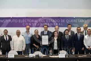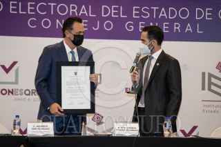 QUERÉTARO, QUERÉTARO, 13JUNIO2021.- Mauricio Kuri González recibió del Instituto Electoral del Estado de Querétaro (IEEQ) la constancia de mayoría que lo acredita como Gobernador Constitucional Electo del Estado de Querétaro para el periodo 2021-2027. Kuri González agradeció a todas y todos los ciudadanos que participaron como funcionarios de casillas, a la autoridad electoral por un trabajo ejemplar, a las y los candidatos que contendieron; a quienes votaron por su proyecto y a su familia por el apoyo y respaldo en este nuevo reto llamado Querétaro. En compañía de su familia, el gobernador electo recibió este documento que, con el 54 por ciento de los votos de las y los queretanos, augura las condiciones de gobernabilidad. Al evento le acompañaron Marko Cortés, dirigente nacional del PAN; Agustín Dorantes, presidente estatal del PAN y coordinador de esta campaña; así como Martín Arango, representante de Acción Nacional ante el IEEQ. FOTO: DEMIÁN CHÁVEZ/CUARTOSCURO.COM
