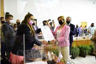 CHIHUAHUA, CHIHUAHUA, 14JUNIO2021.- Maru Campos, candidata a la gubernatura de Chihuahua por la alianza PAN-PRD, recibió su constancia de mayoría en el Instituto Electoral del Estado de Chihuahua. FOTO: CUARTOSCURO.COM