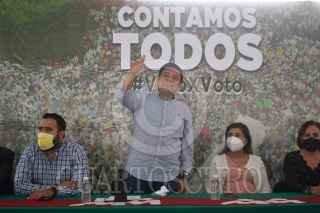 CHILPANCINGO, GUERRERO, 14JUNIO2021.- El excandidato a la gubernatura de Guerrero por la alianza PRI-PRD, Mario Moreno Arcos, dio a conocer que impugnará los resultados de elección del 6 de junio por presuntas irregularidades; además acusó al presidente de la república, Andrés Manuel López Obrador, de haber estado en “campaña” permanente y al Instituto Electoral y de Participación Ciudadana (IEPC) de violar los principios de neutralidad e imparcialidad del proceso electoral. Este lunes en conferencia de prensa en Chilpancingo, fijó postura respecto al resultado oficial de la elección, donde fue declarada como ganadora la hoy gobernadora electa, Evelyn Salgado Pineda, postulada por Morena, quien el día domingo recibió su constancia de mayoría. Moreno Arcos, acompañado de los dirigentes del PRI y PRD, Héctor Apreza Patrón y Alberto Catalán Bastida respectivamente, aseguró que hay elementos que confirman diversas irregularidades por parte del IEPC antes, durante e incluso después de la jornada electoral, por lo que hará valer su derecho de impugnar la elección. FOTO: DASSAEV TÉLLEZ ADAME/CUARTOSCURO.COM
