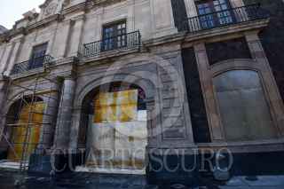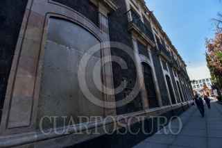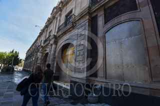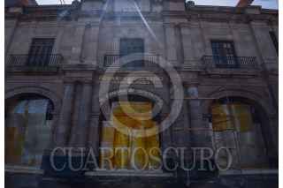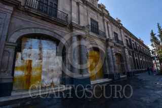 TOLUCA, ESTADO DE MÉXICO, 16JUNIO2021.- Después de las pintas y quema que sufrieran las puertas principales de la Cámara de diputados local durante la permanencia del campamento de feministas radicales, fueron colocadas láminas de acero para proteger la entrada, en lo que se realizan los trabajos de cambio de las mismas. FOTO: CRISANTA ESPINOSA AGUILAR /CUARTOSCURO.COM