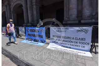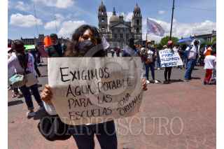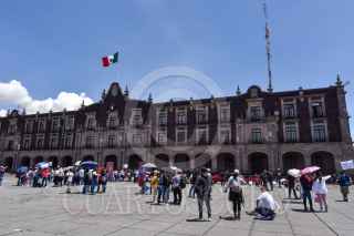 TOLUCA, ESTADO DE MÉXICO, 17JUNIO2021.- Integrantes de la Coordinadora de Escuelas Democráticas en el Estado de México CEDEM se manifestaron frente a Palacio de Gobierno para exigir un retorno a clases seguro para estudiantes, padres de familia y maestros, servicios básicos en las escuelas, como agua potable, luz, drenaje, y consideraron una burla el material para sanitizar que fue entregado por parte de Gobierno del Estado. FOTO: CRISANTA ESPINOSA AGUILAR /CUARTOSCURO.COM