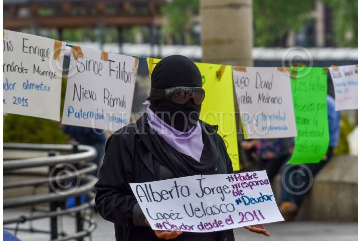 TOLUCA, ESTADO DE MÉXICO, 20JUNIO2021.- Feministas de la Cabecera Edomex realizaron un tendedero de Deudores Alimentarios y Paternidades Ausentes, en la Plaza González Arratia; invitaron a las mujeres a denunciar a los hombres que han huido a su responsabilidad. FOTO: CRISANTA ESPINOSA AGUILAR /CUARTOSCURO.COM