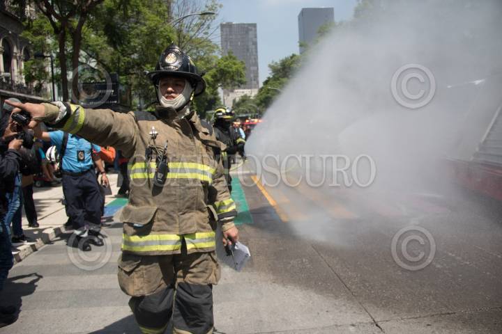 CIUDAD DE MÉXICO. 21JUNIO2021.- El H. Cuerpo de Bomberos realizo un simulacro en el rescate de una persona etrapada en un edificio y la contención de un incendio un una casa, en plena avenida Juárez, mientras un helicoptero de la SSC vigilaba las maniobras de los vulcanos. FOTO: VICTORIA VALTIERRA/CUARTOSCURO.COM
