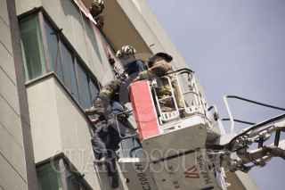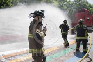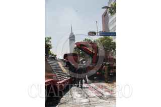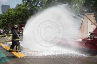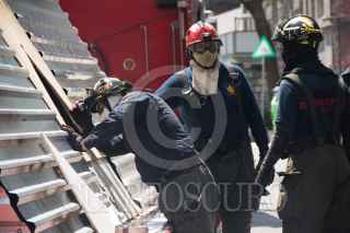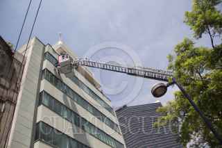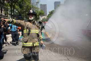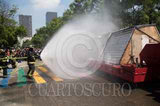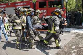 CIUDAD DE MÉXICO. 21JUNIO2021.- El H. Cuerpo de Bomberos realizo un simulacro en el rescate de una persona etrapada en un edificio y la contención de un incendio un una casa, en plena avenida Juárez, mientras un helicoptero de la SSC vigilaba las maniobras de los vulcanos. FOTO: VICTORIA VALTIERRA/CUARTOSCURO.COM