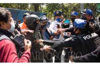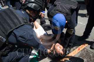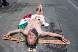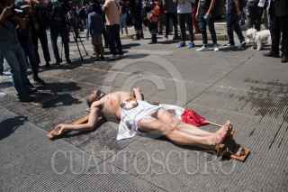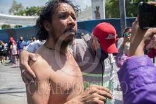 CIUDAD DE MÉXICO. 21JUNIO2021.-Un hombre que decía ser el Mesías, con una cruz se aposto en la avenida Juárez durante el simulacro de sismos en la Capital. Fotografos se hicieron de palabras con integrantes de la Policía Capitalina. FOTO: VICTORIA VALTIERRA/CUARTOSCURO.COM