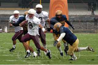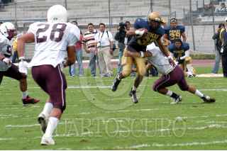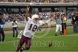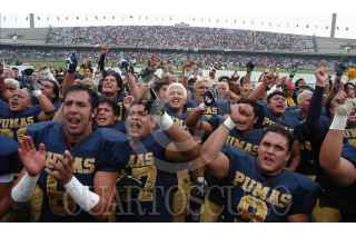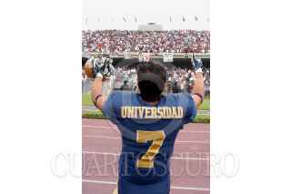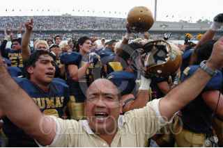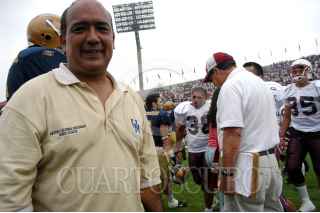 MÉXICO D.F. 9SEPTIEMBRE2006.- Pumas CU venció con marcador de 9-7 a las Águilas Blancas del IPN, en juego de temporada de liga mayor 2006 de futból americano, que se llevo acabo en el Estadio Olímpico Univarsitario. Arturo Alonzo Escobar, entrenador en jefe del equipo festeja la victoria de los Pumas. FOTO. GUILLERMO PEREA/CUARTOSCURO.COM