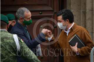 CIUDAD DE MÉXICO, 24JUNIO2021.- Hugo López-Gatell, subsecretario de Prevención y Promoción de la Salud, junto a Zoé Robledo, director general del Instituto Mexicano del Seguro Social (IMSS), se despiden después de una reunión en Palacio Nación. FOTO: MARIO JASSO/CUARTOSCURO.COM