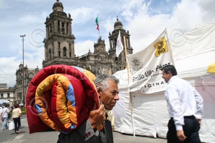 MÉXICO, D.F. 14SEPTIEMBRE2006.- En la plancha del Zócalo, el ambiente ante la celebración del grito de independencia comienza a acelerarse. Junto al templete donde López Obrador pronuncia sus discursos en las asambleas, se ubica la campana que resonará en manos se AMLO. FOTO: PAOLA HIDALGO/CUARTOSCURO.COM