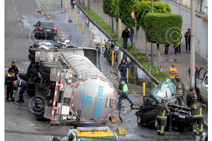 CIUDAD DE MÉXICO, 29JUNIO2021.- La mañana de este martes un trailer cargado con 30 mil litros de agua, se volcó y aplastó un automóvil al girar en una curva sobre el eje 5 y Avenida República Federal, en la Alcaldía Iztapalapa al ir conduciendo con exceso de velocidad, el conductor del auto salió solo con unas cuantas heridas en su brazo izquierdo. FOTO: ARMANDO MONROY /CUARTOSCURO.COM