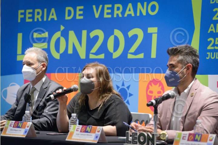 CIUDAD DE MÉXICO, 30JUNIO2021.- Manuel Rodríguez Villamil, secretario general CONCANACO SERVYTUR; Guadalupe Robles León, directora general del Patronato de la Feria Estatal de León y Parque Ecológico; Jorge Cabrejos Moreno, director de Mercadotecnia de la Secretaría de Turismo de Guanajuato; Juan Carlos Muñoz Márquez, presidente del Patronato de la Feria Estatal de León y Parque Ecológico; Gloria Magaly Cano, directora general de Hospitalidad y Turismo de León; y Luis Felipe Bravo Mena, representante del Gobierno de Guanajuato, durante conferencia de prensa presentaron la Feria de Verano León 2021 que se llevará a cabo del 2 al 25 de julio, contando con: actos circenses, venta de artesanías, conciertos y juegos mecánicos. FOTO: MARIO JASSO/CUARTOSCURO.COM