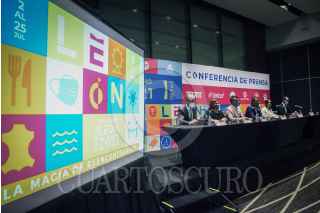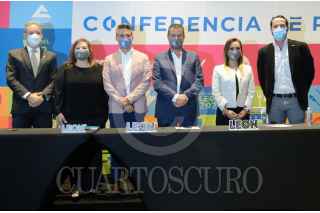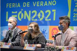 CIUDAD DE MÉXICO, 30JUNIO2021.- Manuel Rodríguez Villamil, secretario general CONCANACO SERVYTUR; Guadalupe Robles León, directora general del Patronato de la Feria Estatal de León y Parque Ecológico; Jorge Cabrejos Moreno, director de Mercadotecnia de la Secretaría de Turismo de Guanajuato; Juan Carlos Muñoz Márquez, presidente del Patronato de la Feria Estatal de León y Parque Ecológico; Gloria Magaly Cano, directora general de Hospitalidad y Turismo de León; y Luis Felipe Bravo Mena, representante del Gobierno de Guanajuato, durante conferencia de prensa presentaron la Feria de Verano León 2021 que se llevará a cabo del 2 al 25 de julio, contando con: actos circenses, venta de artesanías, conciertos y juegos mecánicos. FOTO: MARIO JASSO/CUARTOSCURO.COM