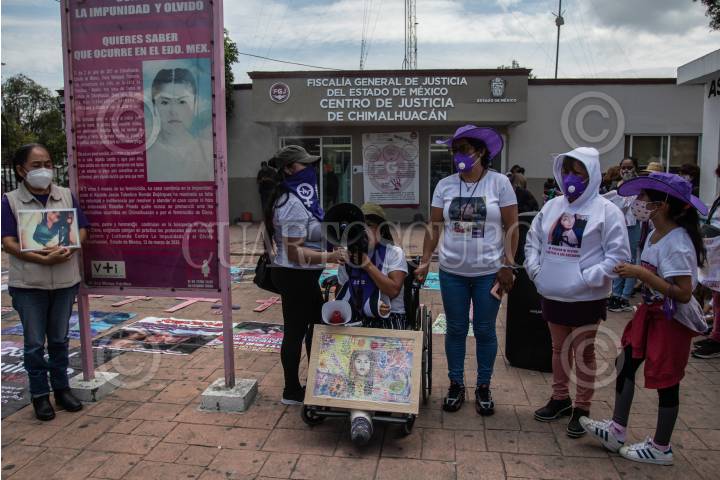CHIMALHUACÁN, ESTADO DE MÉXICO, 02JULIO2021.- Diana Velázquez Florencio, de 24 años salió de su casa un 2 de julio de 2017 para realizar una llamada y jamás regreso. Su cuerpo fue encontrado a unas cuadras de la Plaza Chimalhuacán con signos de violencia. Desde entonces su madre Lidia Florencia trabaja y lucha para que la justicia y verdad llegue para Diana. Hoy, madres de víctimas de feminicidio, familiares de Diana y colectivas feministas del Estado de México, realizaron una protesta pacifica por el cumplimiento de 4 años de feminicidio de la joven. El contingente partió del Centro de justicia de Chimalhucán hacía donde se encuentra el mural de Diana. FOTO: ANDREA MURCIA /CUARTOSCURO.COM