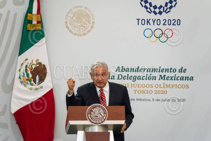 CIUDAD DE MÉXICO, 05JULIO2021.- Andrés Manuel López Obrador, presidente de México, en compañía de Claudia Sheinbaum, jefa de gobierno; Ana Gabriela Guevara, titular de la CONADE; Delfina Gómez, secretaria de Educación Pública; Carlos Padilla, titular del Comité Olímpico Mexicano (COM); Ruth Castillo Galindo, primera mujer en participar en Gimnasia Rítmica en JO; Arturo Herrera, secretario de Hacienda, así como representante de Marina y SEDENA, presidieron el abanderamiento de la federación mexicana que competirá en los Juegos Olímpicos de Tokyo 2020, los cuales se postergaron un año debido a la pandemia de Covid-19. El mandatario anunció que habrá recompensa para todos aquellos que integran la federación y una sorpresa para quienes traigan presea. FOTO: GALO CAÑAS/CUARTOSCURO.COM
