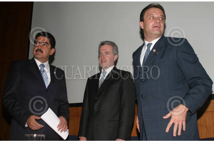 MÉXICO, D.F., 14SEPTIEMBRE2006.- Manuel Espino presidente del Partido Acción Nacional (PAN), Santiago Creel Miranda coordinador de la bancada panista en la Camara de Senadores, y José Espina Secretario general del PAN durante el festejo con motivo del 67 aniversario del PAN FOTO: SAUL LOPEZ ESCORCIA/CUARTOSCURO.COM