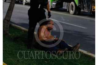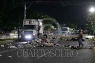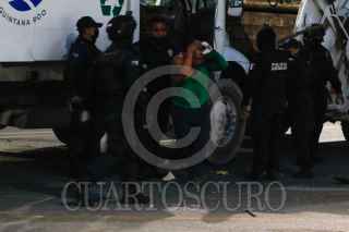 CANCÚN, QUINTANA ROO, 05JULIO2021.- Policías y manifestantes lesionados, reporteros detenidos y daños materiales fue el saldo de la riña que se registró entre elementos de la Policía Quintana Roo y trabajadores de Inteligencia México. Los recolectores de basura se negaron a negociar, y alrededor de las 20:00 hrs se inició un operativo para retirar los camiones que obstaculizaban la vialidad. Fue cuando se pretendió retirar los vehículos, que la lluvia de piedras se dejó caer contra los policías, lo que desató la trifulca que dio la detención de seis personas por daños y lesiones. FOTO: ELIZABETH RUIZ/CUARTOSCURO.COM