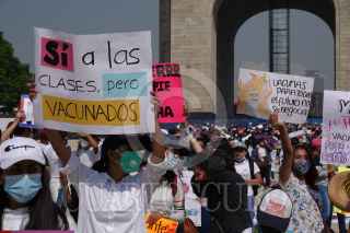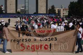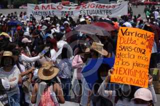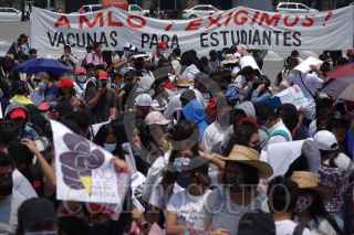 CIUDAD DE MÉXICO, 06JULIO2021.- Estudiantes que integran la Federación Nacional de Estudiantes Revolucionarios Rafael Ramírez (FNERRR) marcharon de Monumento a la Revolución al Zócalo capitalino para exigir al gobierno agilizar la vacunación contra la covid-19 en jóvenes, a fin de volver de manera segura a clases presenciales. FOTO: GALO CAÑAS/CUARTOSCURO.COM