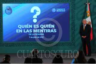 CIUDAD DE MÉXICO, 07JULIO2021.- Andrés Manuel López Obrador, presidente de México, encabeza la conferencia mañanera de este miércoles, la cual se lleva a cabo en el Salón Tesorería de Palacio Nacional. Durante el evento se trataron los temas de las noticias falsas que salieron a lo largo de la semana, así como de la próxima consulta ciudadana para enjuiciar a los ex presidentes mexicanos. FOTO: DANIEL AUGUSTO /CUARTOSCURO.COM