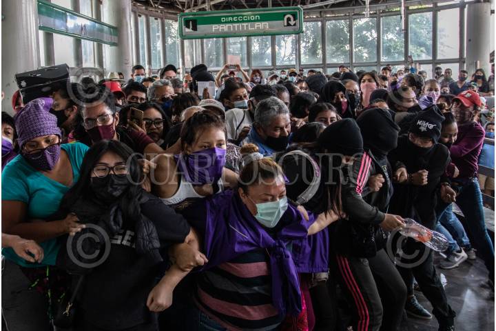 CIUDAD DE MÉXICO, 07JULIO2021.- Mujeres comerciantes que integran la colectiva feminista Merkadita Feminista acudieron al metro San Lázaro donde se encontraban algunas chicas encapsuladas por elementos de seguridad del Metro para que las dejaran trabajar. Al no lograr respuesta las protestantes realizaron una vaya que bloqueaba los pasos de transbordo a usuarios lo cual porovoco que estos las aventaran y brincaran sus cierres. Al finalizar policías se retiraron y las chicas realizaron pintas con manos en las paredes de la estación. FOTO:ANDREA MURCIA /CUARTOSCURO.COM