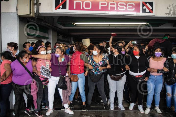 CIUDAD DE MÉXICO, 07JULIO2021.- Mujeres comerciantes que integran la colectiva feminista Merkadita Feminista acudieron al metro San Lázaro donde se encontraban algunas chicas encapsuladas por elementos de seguridad del Metro para que las dejaran trabajar. Al no lograr respuesta las protestantes realizaron una vaya que bloqueaba los pasos de transbordo a usuarios lo cual porovoco que estos las aventaran y brincaran sus cierres. Al finalizar policías se retiraron y las chicas realizaron pintas con manos en las paredes de la estación. FOTO:ANDREA MURCIA /CUARTOSCURO.COM