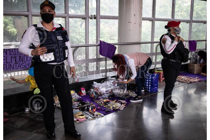CIUDAD DE MÉXICO, 07JULIO2021.- Mujeres comerciantes que integran la colectiva feminista Merkadita Feminista acudieron al metro San Lázaro donde se encontraban algunas chicas encapsuladas por elementos de seguridad del Metro para que las dejaran trabajar. Al no lograr respuesta las protestantes realizaron una vaya que bloqueaba los pasos de transbordo a usuarios lo cual porovoco que estos las aventaran y brincaran sus cierres. Al finalizar policías se retiraron y las chicas realizaron pintas con manos en las paredes de la estación. FOTO:ANDREA MURCIA /CUARTOSCURO.COM