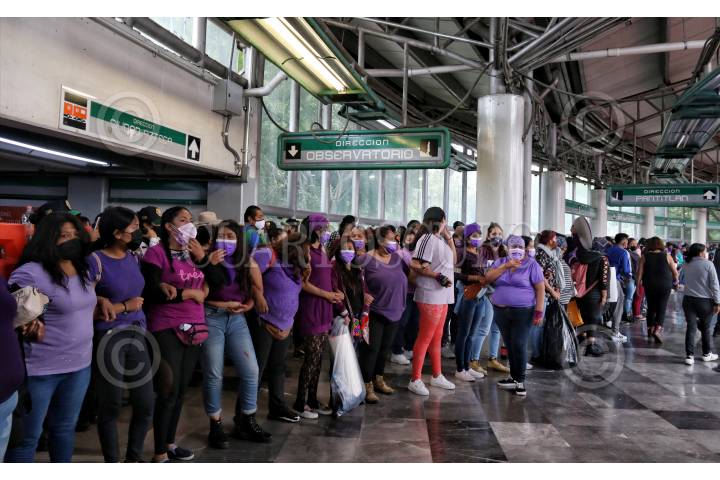 CIUDAD DE MÉXICO, 07JULIO2021.- Mujeres comerciantes que integran la colectiva feminista Merkadita Feminista acudieron al metro San Lázaro donde se encontraban algunas chicas encapsuladas por elementos de seguridad del Metro para que las dejaran trabajar. Al no lograr respuesta las protestantes realizaron una vaya que bloqueaba los pasos de transbordo a usuarios lo cual porovoco que estos las aventaran y brincaran sus cierres. Al finalizar policías se retiraron y las chicas realizaron pintas con manos en las paredes de la estación. FOTO:ANDREA MURCIA /CUARTOSCURO.COM