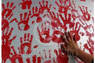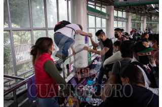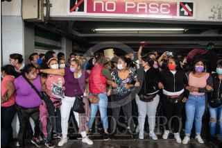 CIUDAD DE MÉXICO, 07JULIO2021.- Mujeres comerciantes que integran la colectiva feminista Merkadita Feminista acudieron al metro San Lázaro donde se encontraban algunas chicas encapsuladas por elementos de seguridad del Metro para que las dejaran trabajar. Al no lograr respuesta las protestantes realizaron una vaya que bloqueaba los pasos de transbordo a usuarios lo cual porovoco que estos las aventaran y brincaran sus cierres. Al finalizar policías se retiraron y las chicas realizaron pintas con manos en las paredes de la estación. FOTO:ANDREA MURCIA /CUARTOSCURO.COM
