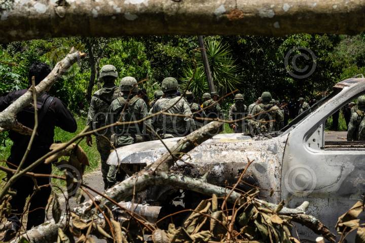 PANTELHO, CHIAPAS, 09JULIO2021.- Más de un centenar de militares permanecen entre los municipios de Pantelhó y Chenalho desde hace tres días, de acuerdo a testimonios de algunos de estos elementos del Ejército Nacional. En el piso se observas cientos de casquillos de alto calibre y una marca de lo que parece el impacto de una bomba. FOTO: ISABEL MATEOS /CUARTOSCURO.COM