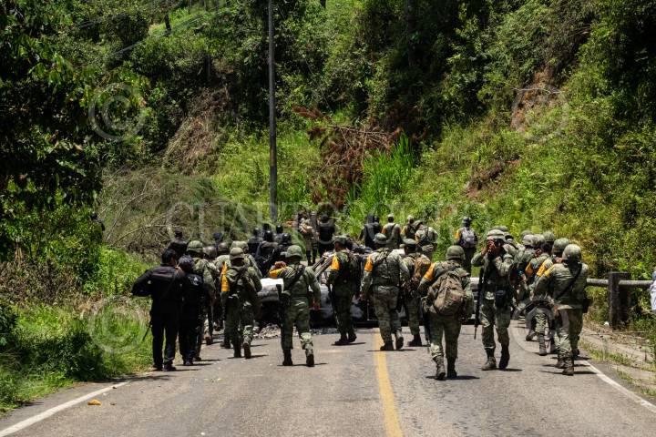 PANTELHO, CHIAPAS, 09JULIO2021.- Más de un centenar de militares permanecen entre los municipios de Pantelhó y Chenalho desde hace tres días, de acuerdo a testimonios de algunos de estos elementos del Ejército Nacional. En el piso se observas cientos de casquillos de alto calibre y una marca de lo que parece el impacto de una bomba. FOTO: ISABEL MATEOS /CUARTOSCURO.COM