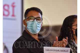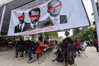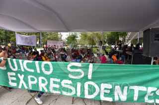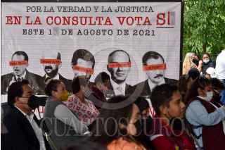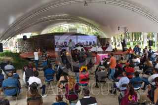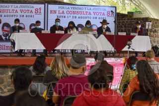 TOLUCA, ESTADO DE MÉXICO, 10JULIO2021.- Omar García, Sobreviviente de Ayotzinapa, Ariadna Bahena, víctima de desplazamiento en Guerrero y Miriam Lisete Pérez Millan, Coordinadora Estatal de la Consulta Popular en el Estado de México, durante la Asamblea Informativa para enjuiciar a los ex presidentes de México en el Parque Cuauhtémoc Alameda Central. FOTO: CRISANTA ESPINOSA AGUILAR /CUARTOSCURO.COM