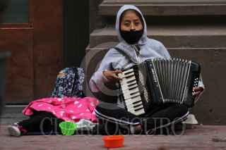 CIUDAD DE MÉXICO, 13JULIO2021.- Una mujer toca el acordeón para ganarse unas monedas en el Centro Histórico. FOTO: GRACIELA LÓPEZ /CUARTOSCURO.COM