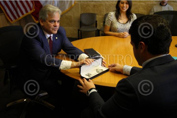 AUSTIN, TEXAS, 14JULIO2021.- Samuel Garcia Sepúlveda, gobernador electo de Nuevo León, recibió del alcalde de Austin, Texas, Steve Adler, la llave de la ciudad. Por primera vez un gobernador electo recibió esa distinción de la autoridad de Austin, que ocurrió al concluir la primera reunión que García Sepúlveda tuvo este día. Adler y el próximo mandatario estatal se reunieron en el City Hall para conversar sobre temas de inversión, la oficina de representación, el corredor comercial Nuevo León-Austin, entre otros. FOTO: CUARTOSCURO.COM