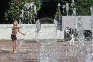 CIUDAD DE MÉXICO, 10JULIO2021.- Un niño se refresca junto a su mascota en las fuentes de la alcaldía Benito Juárez. FOTO: MARIO JASSO/CUARTOCURO.COM