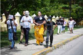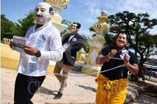 CAMPECHE, CAMPECHE, 16JULIO2021.-Jóvenes adherentes al partido morena caracterizados por los ex presidentes caminaron por las principales calles del centro de la capital con la finalidad de promocionar el voto a la consulta ciudadana del próximo primero de agosto para enjuiciar a los ex presidentes. En Campeche se necesita 309 mil votos para que la consulta sea enlazada. FOTO: MICHAEL BALAM /CUARTOSCURO.COM